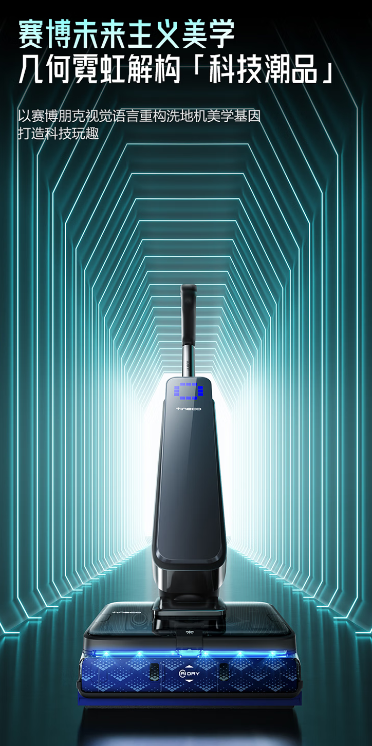 添可芙万科学家系列的外观设计同样令人惊艳。它大胆采用了“赛博未来主义美学”,硬朗的几何线性切割与黄金圆角碰撞出精密的机械感;行业首创的像素风点阵屏,以复古又新潮的霓虹光效,让清洁状态和机器信息一目了然,科技玩趣十足。