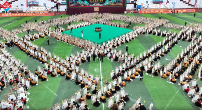 授课结束后,身穿藏族服饰的千名唐卡画师坐姿呈盘曲缠绕形,全神贯注投入到唐卡创作中。13时30分许,参赛画师们陆续完成了创作,静等吉尼斯世界纪录官方工作人员的复核和认证。