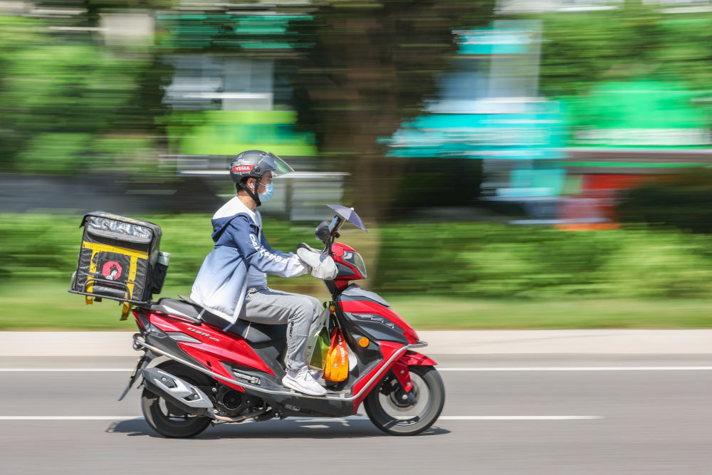 10月1日,在重庆市渝北区,一名外卖小哥在辛勤工作。新华社记者 黄伟 摄
