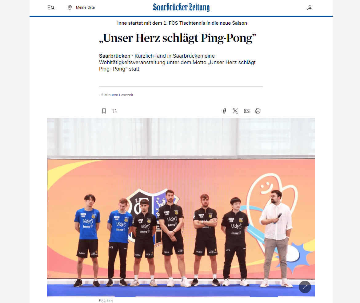 9月28日,德国主流媒体《萨尔布吕肯报》(Saarbrücker Zeitung)发布报道,聚焦萨尔布吕肯当地知名儿童营养品牌inne(中文名:因你)与欧洲乒坛劲旅——萨尔布吕肯乒乓球俱乐部(1. FC Saarbrücken TT)共同发起的“Ping Pong for Love”公益活动。