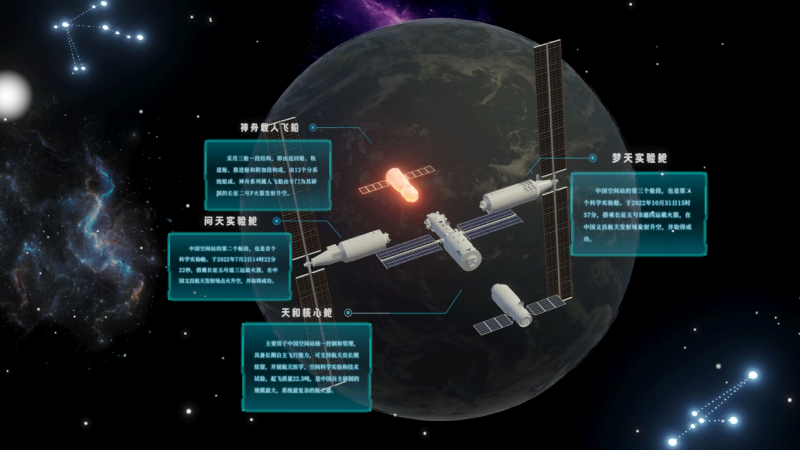 在航天区,仿佛一脚迈入璀璨银河,八大行星循着真实轨道缓缓转动,而中国天宫空间站,正围绕着蓝色地球缓缓运行,空间站还会在眼前“拆解”,“天和”核心舱、“问天”实验舱、“梦天”实验舱、“神舟”载人飞船、“天舟”货运飞船的连接结构一目了然。当体验者伸出右手,1:1还原的“天和”核心舱在掌心展现,无需翻阅书本、观看视频,就能近距离探索航天装备的细节,直观感受中国航天事业的硬核实力,让曾经遥远的银河与空间站,变成触手可及的科普课堂。