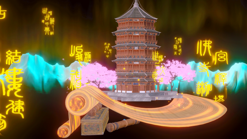 古建区则成为了科技赋能传统文化的新窗口。在这里,应县木塔这座木构建筑奇迹的搭建过程,通过动态AR动画完整呈现,古人建筑智慧和匠人精湛的技艺一目了然,点击画面中悬浮的“气泡”,还能瞬间获取“榫卯结构如何承重”“无钉无铆为何能屹立千年”的科普解读,让古人的营造智慧不再抽象。同时体验者能借助AR“穿越”进入塔内,身临其境地欣赏壁画和佛像,在虚实光影的交织中,深切体会中华古建筑的文化神韵与不朽智慧。