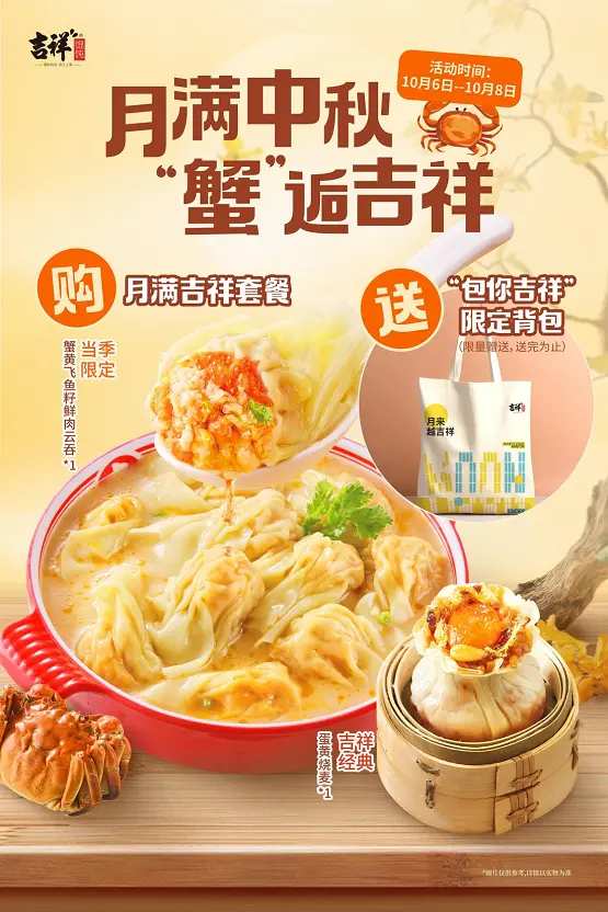 为迎接中秋与国庆双节,吉祥馄饨特别策划了主题为“月满中秋 蟹逅吉祥”的限时促销活动。活动将于10月6日至10月8日持续三天,期间推出精心搭配的“月满吉祥”套餐,内含一碗蟹黄飞鱼籽鲜肉云吞及一个香糯可口的蛋黄烧麦,营养搭配,满足多样需求。