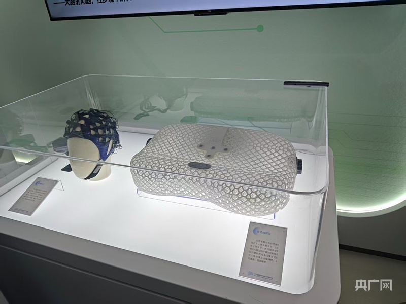 在展厅里,记者看到了一款特别的“枕头”——广东省智能科学与技术研究院与企业联合研发的首款多模态梦境脑机接口设备“梦邻”。其通过“枕头”形态设计,将脑机接口技术与日常睡眠场景结合,为“精准睡眠干预”与“主动健康管理”提供技术工具。