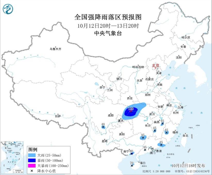 中央气象台10月12日18时继续发布暴雨蓝色预警,预计,10月12日20时至13日20时,陕西东南部、四川东北部、重庆中北部、湖北西部、河南西南部等地的部分地区有大到暴雨,其中,重庆北部等地局地大暴雨(100~120毫米)。另外,广东东部和西南部、广西南部、海南岛西部、湖南南部、江西南部和东部、福建西部等地局地有大雨或暴雨(50~80毫米),上述部分地区伴有短时强降水(最大小时降雨量20~40毫米,局地可超过50毫米),局地有雷暴大风等强对流天气。