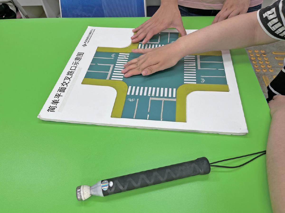 学员们正在用手触摸交叉路口示意图,了解红绿灯、车道和斑马线的方位,一旁是收缩起来的盲杖。