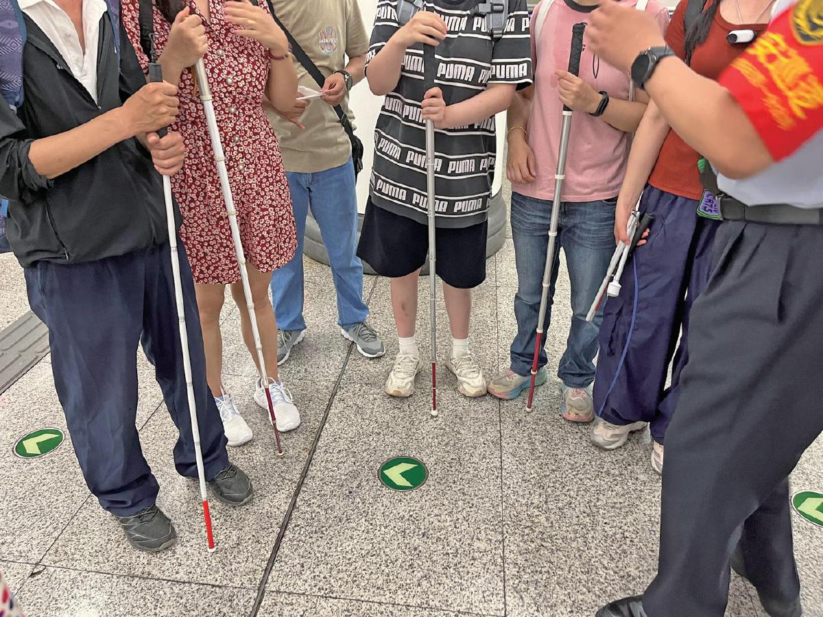 学员们拿着盲杖,在工作人员的帮助下乘坐地铁。