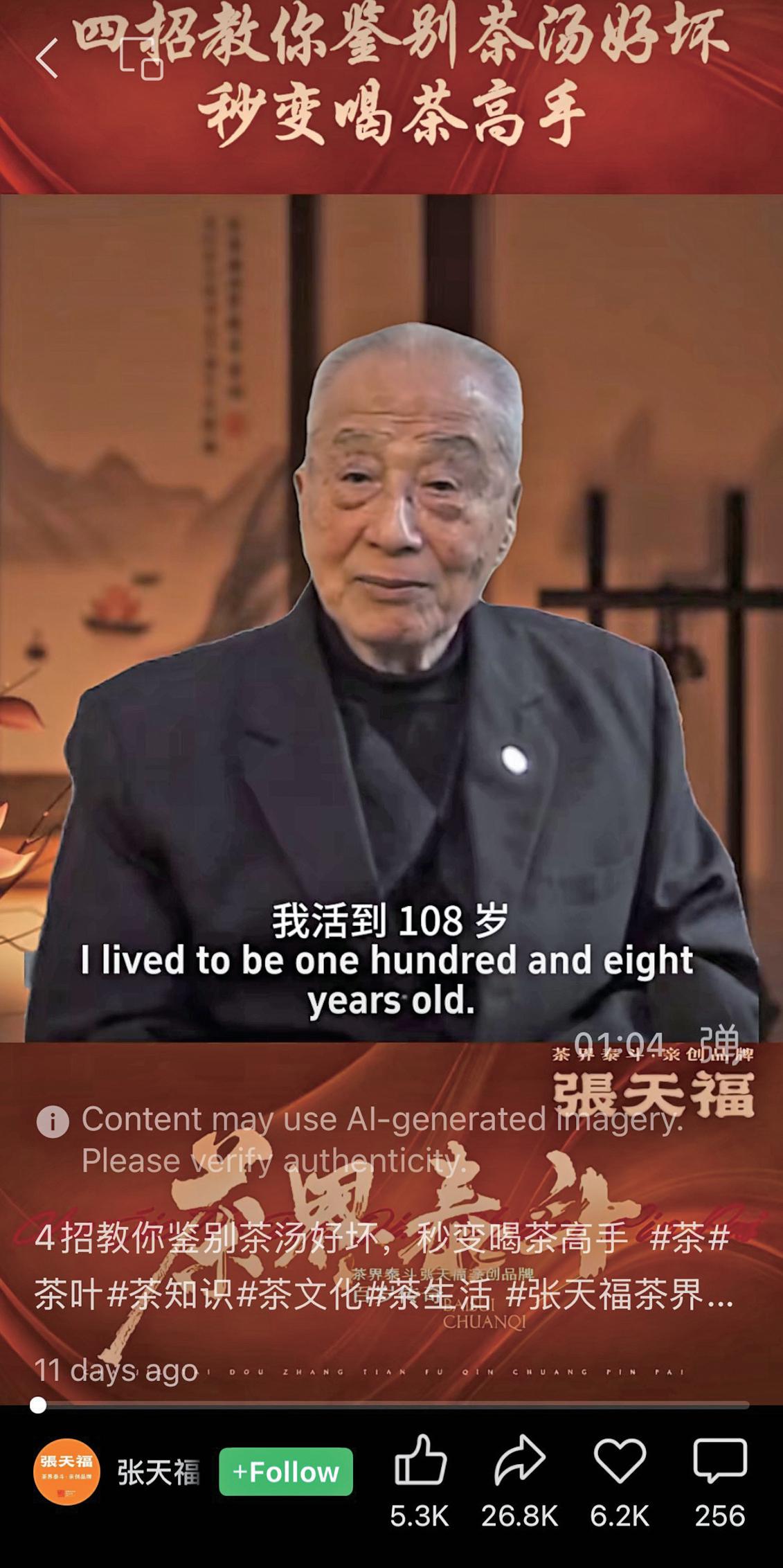 “我活到108岁,试茶80多年了。”10月初发布在网络上的一段视频里,这句话由“茶界泰斗”张天福“亲口”说出。他身着黑衣,神态平和,娓娓讲述品茶技巧。