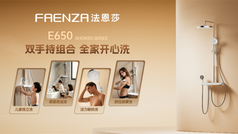 当淋浴空间从基础清洁升级为 “深度疗愈” 与 “全龄共享” 的多元场域,法恩莎精准捕捉这一需求变迁,推出 E650系列淋浴花洒,直接突破传统花洒的单一场景限制。E650系列淋浴花洒独特双手持设计,小手持配可调节卡座,儿童易操作:宠物洗澡无需手忙脚乱,硅胶触点理毛、按摩一步到位。顶喷、小手持、背喷、大手持、下出水五功能,全面适配全家沐浴偏好:儿童独立洗,萌宠灵活洗,成人多水路澎湃洗与舒压按摩洗,轻松打造全家开心洗的共享式沐浴解决方案。