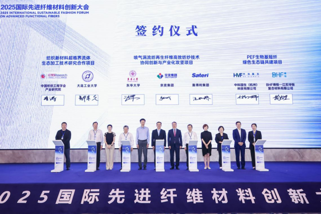聚焦产业链上下游的协同创新,本次大会举行了11个重点项目签约仪式,覆盖低碳材料研发突破、纺纱技术创新、功能性面料升级、人工智能赋能制造等关键方向。