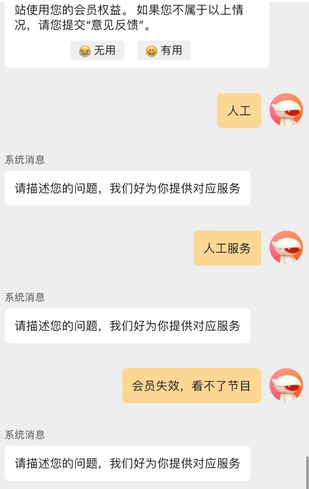康阿姨的遭遇不是个例,记者调查发现,不少视频网站都存在类似情况。开通会员、续费等标识十分明显,“客服”入口却相当难找;部分平台的智能客服只能识别预设问题,若用户描述超出模板范围,仅能机械回复“请描述您的问题,我们好为你提供对应服务”,既不转接人工,也不提供其他解决方案。