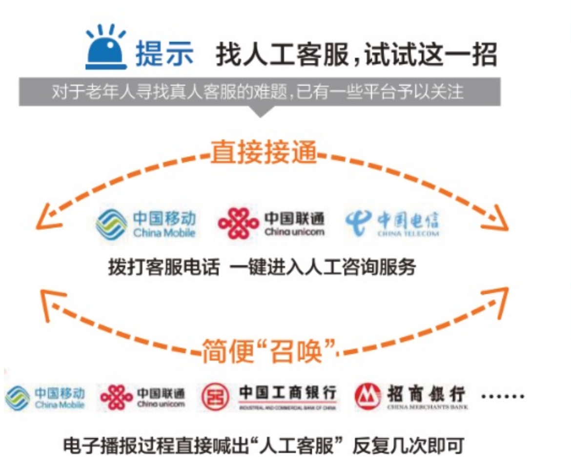 对于老年人寻找真人客服的难题,已有一些平台予以关注。例如目前实名制登记的65岁以上老年人拨打三家电信运营商客服电话,可一键进入人工咨询服务,不必经过语音提示和数字选择步骤。而未实名注册的老年人,也可尝试直接说出“人工服务”,以“召唤”真人客服。记者亲测移动、联通客服电话,都是可以实现的。