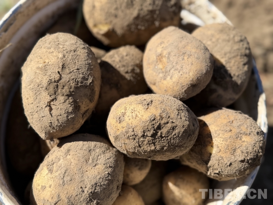 走进南木林县艾玛乡山巴村,丰收的气息扑面而来。田垄间,收获机来回穿梭,铁犁翻起湿润的泥土,转眼便完成分离豆秧、输送土豆的连贯作业。新鲜饱满的土豆顺着输送带滚落田间,农户们紧随其后,弯腰拾捡、分类装袋,动作麻利不停歇。不一会儿,圆润的土豆便堆起一座座“金堆”,田间的笑声与机器的轰鸣相映,满是增收的喜悦与希望。“你看这土豆,个头大、品相好!” 村民罗布次仁拎着装满土豆的桶走来,小心翼翼拿起一颗最大的土豆,像捧着宝贝似的笑着介绍,“今年我家种了6亩地,一斤能卖一块二到一块五左右,今年的土豆又大又好吃,皮薄,我心里特别满意。”