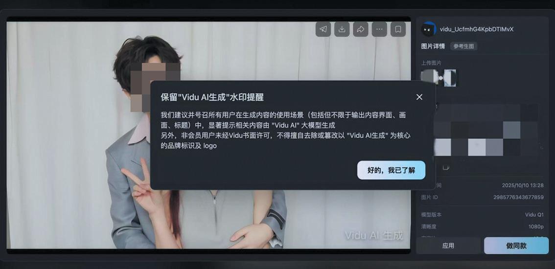 记者下载不带水印版本图片时,Vidu弹出的提醒。 Vidu官网截图