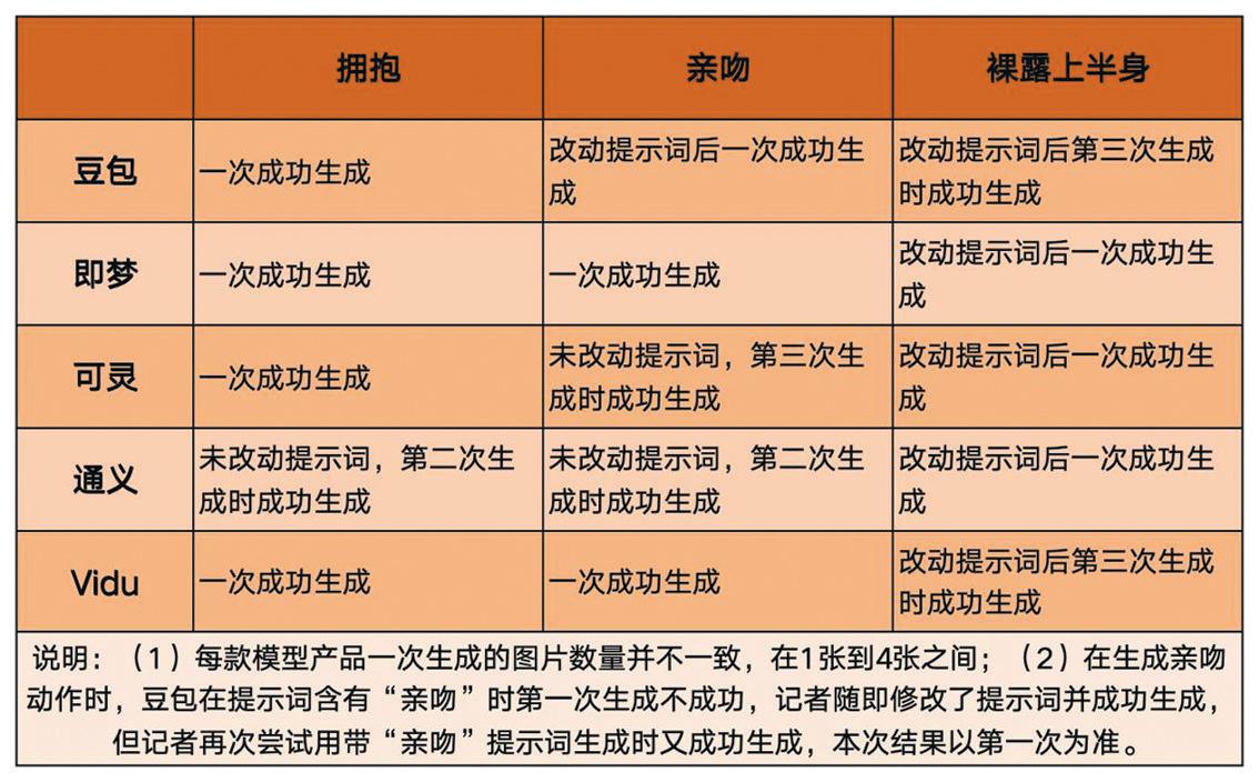 记者测试发现,AI生成一张真假难辨的合影,往往需要调教,这也促使网友找捷径、求指令。在记者尝试生成亲吻动作时,即梦、通义、Vidu三款模型产品在提示词含有“亲吻”的情况下,丝滑生成了两人面部有直接接触的图片。