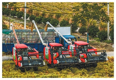 收割机把收获的稻谷装车。以上图片均为新华社记者徐昱摄