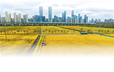 金秋时节,位于浙江杭州市萧山区世纪田园粮食功能区的3000多亩水稻迎来丰收。金黄的稻穗随风起伏,高铁列车呼啸而过,更远处大厦林立,共同构成一幅美丽和谐的城市田园画卷。
