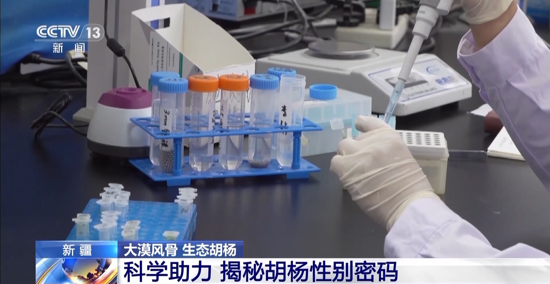 在距离现场大约1200多公里的地方,位于新疆阿拉尔市的塔里木大学的科研团队经过多年的研究,利用分子生物学的技术,找到了能够区别雄株和雌株的分子标记。不管胡杨苗有多大,只需要取一点点,哪怕零点几克的叶片,就可以通过检测,把雄株和雌株鉴别出来,准确率很高。这项研究揭开了胡杨的性别密码,还取得了国家发明专利。