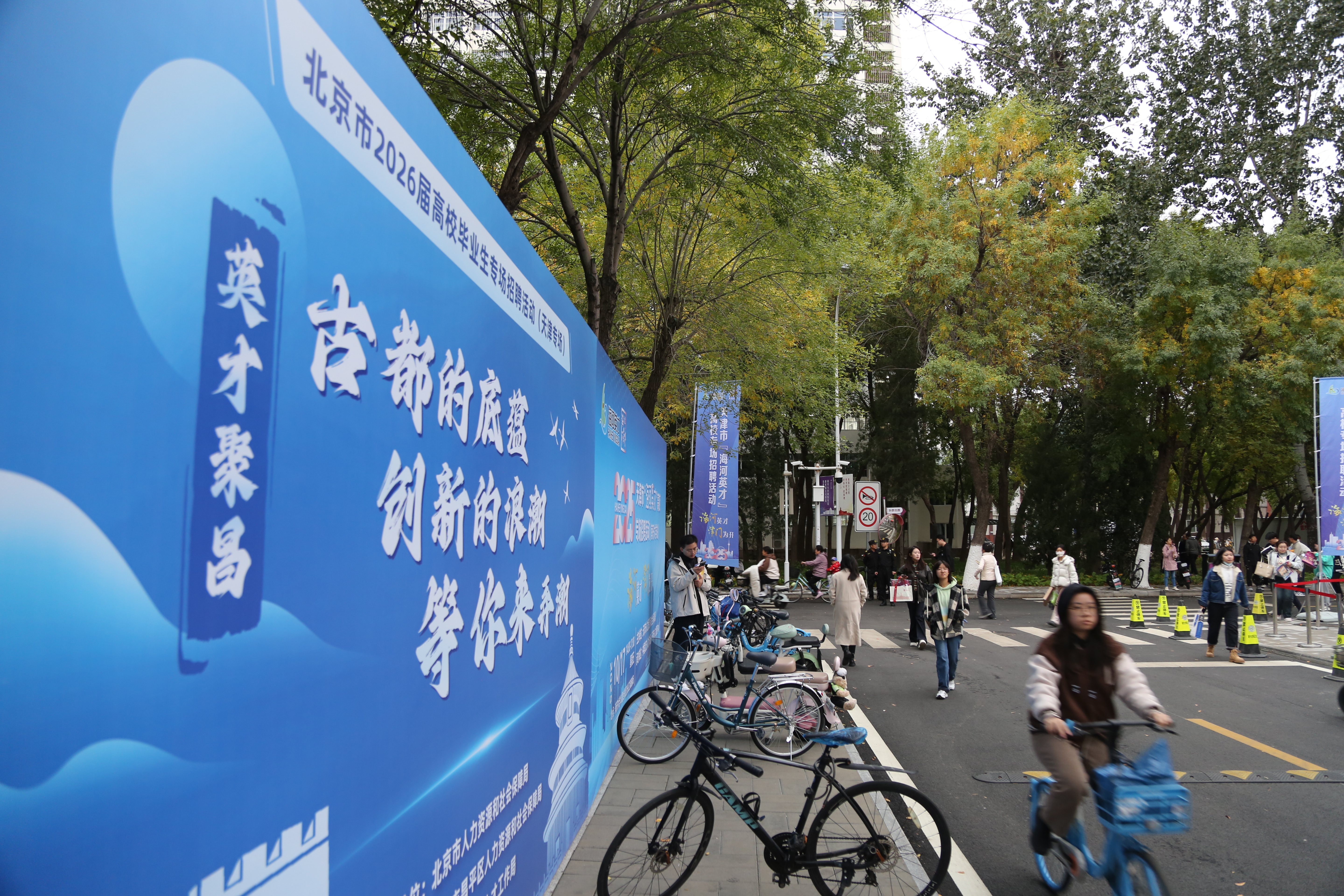 招聘会现场,昌平区各展位前人头攒动,出国学术交流、进京落户、免费班车、包食宿等标签张贴在醒目位置,吸引不少毕业生驻足停留。