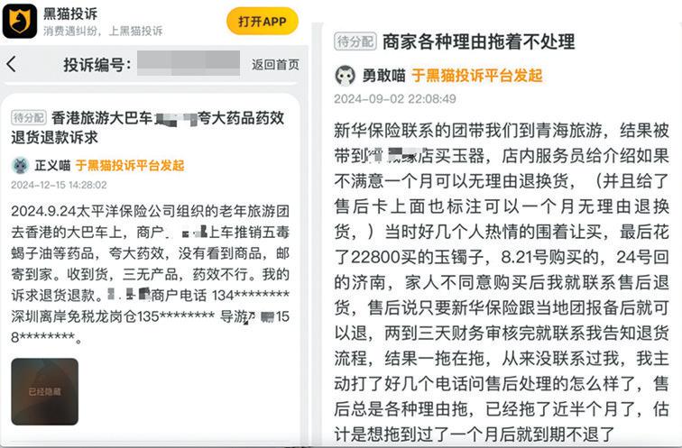 黑猫投诉平台上关于保险公司组织低价游的投诉。 黑猫平台截图