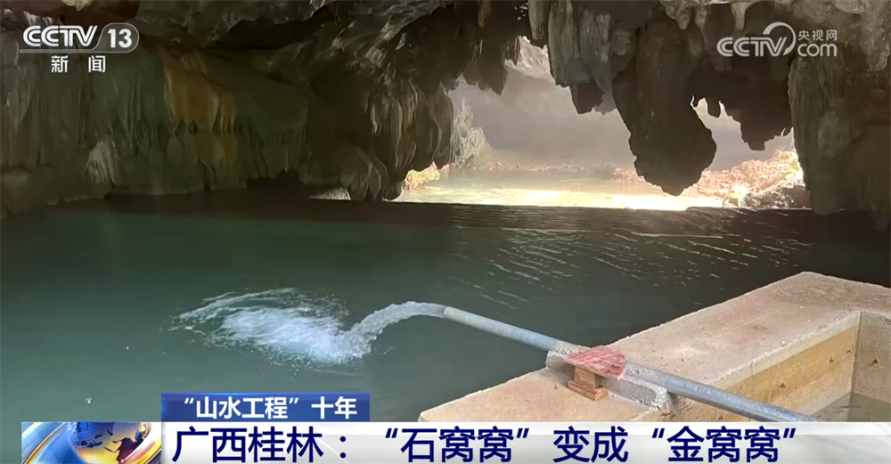 记者来到了南圩地下河的一个天窗位置,在现场可以看到一个拦水坝,工作人员介绍,除了可见的坝体,其实在坝的两端,通过灌浆也形成了一个止水帷幕,可以发挥蓄水的功能。这个图片就展示了上一次蓄水试验时的一个状态。随着上游来水增加,蓄水达到一定高度以后,会驱动水轮泵将地下河的水抬升到天窗的上部,方便附近的居民饮用和灌溉。