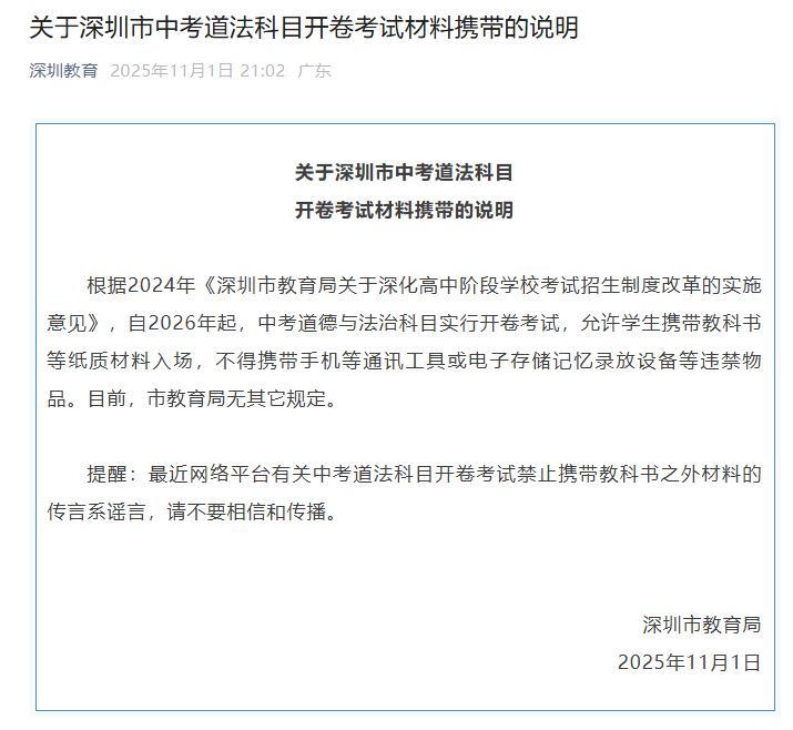央视网消息:据深圳教育微信公众号消息,深圳市教育局11月1日发布《关于深圳市中考道法科目开卷考试材料携带的说明》:根据2024年《深圳市教育局关于深化高中阶段学校考试招生制度改革的实施意见》,自2026年起,中考道德与法治科目实行开卷考试,允许学生携带教科书等纸质材料入场,不得携带手机等通讯工具或电子存储记忆录放设备等违禁物品。目前,深圳市教育局无其它规定。提醒:最近网络平台有关中考道法科目开卷考试禁止携带教科书之外材料的传言系谣言,请不要相信和传播。