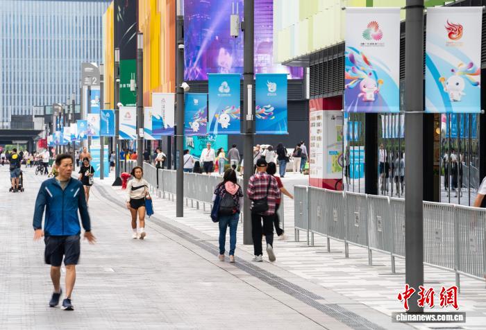 11月1日,香港新晋地标启德体育园的体育大道沿途遍布第十五届全国运动会(简称“十五运会”)装饰宣传元素,静待本届全运会于11月9日正式开幕。图为体育大道沿线悬挂将于11月2日举行的十五运会香港赛区火炬传递活动的装饰宣传物料。 中新社记者 侯宇 摄