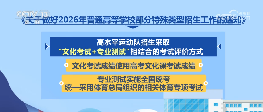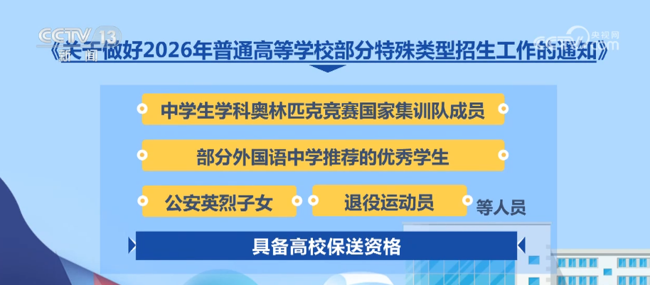 央视网消息:日前,教育部印发《通知》,部署做好2026年普通高校部分特殊类型招生工作。普通高校特殊类型招生主要包括艺术类专业招生、高水平运动队招生、保送生、综合评价招生4类。