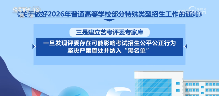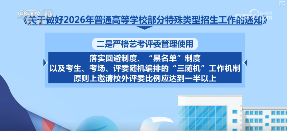 《通知》明确,一要设定考前辅导“禁区”,开展特殊类型招生的相关高校及其内设学院、教职工不得组织、参与或自行开展相关考前辅导、应试培训。二是严格艺考评委管理使用,落实回避制度、“黑名单”制度,以及考生、考场、评委随机编排的“三随机”工作机制,原则上邀请校外评委比例应达到一半以上。三是建立艺考评委专家库,一旦发现评委存在可能影响考试招生公平公正行为,坚决严肃查处并纳入“黑名单”。