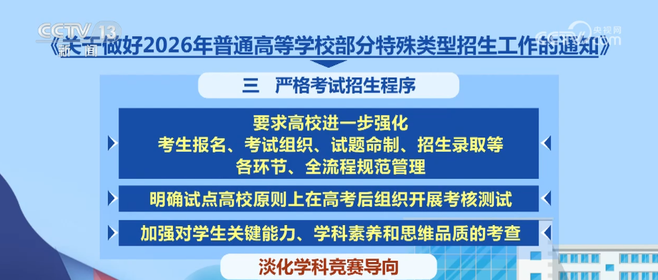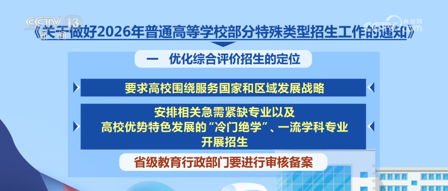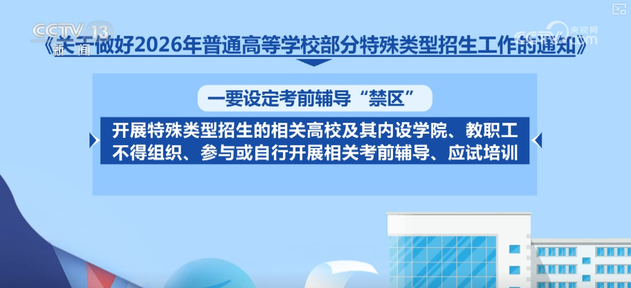 对于2026年普通高校部分特殊类型招生工作,《通知》要求,各地各有关高校建立有效监督机制,畅通社会监督渠道,及时公开公示有关信息,主动接受监督。未按要求公示的考生一律不得录取,牢牢守住公平公正底线。
