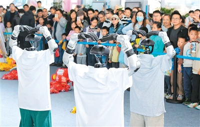 10月25日,江苏省扬州市公安局在扬州市明月湖广场举行警营开放日活动,现场设立多个主题互动展区,市民可以近距离接触警务装备。图为人形机器人与小朋友互动。孟德龙摄(人民视觉)