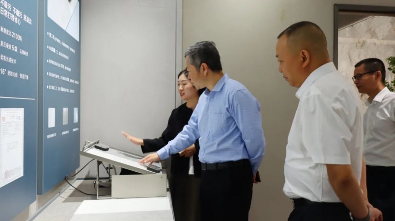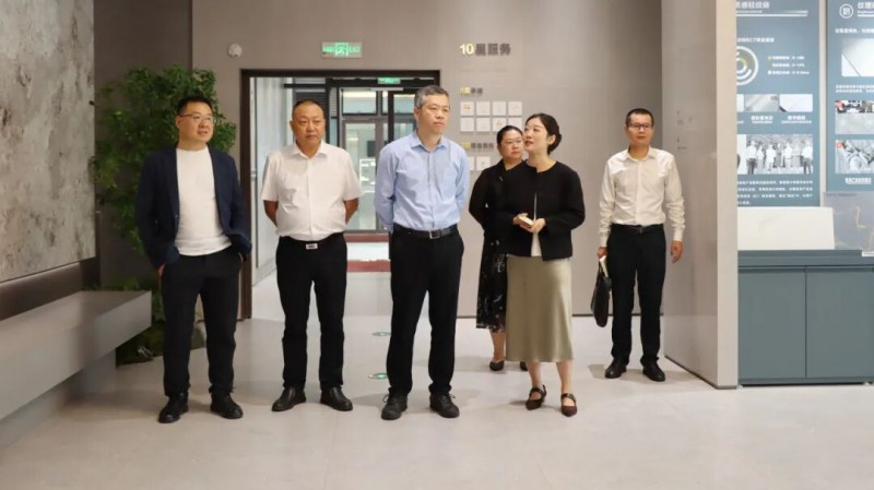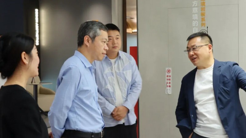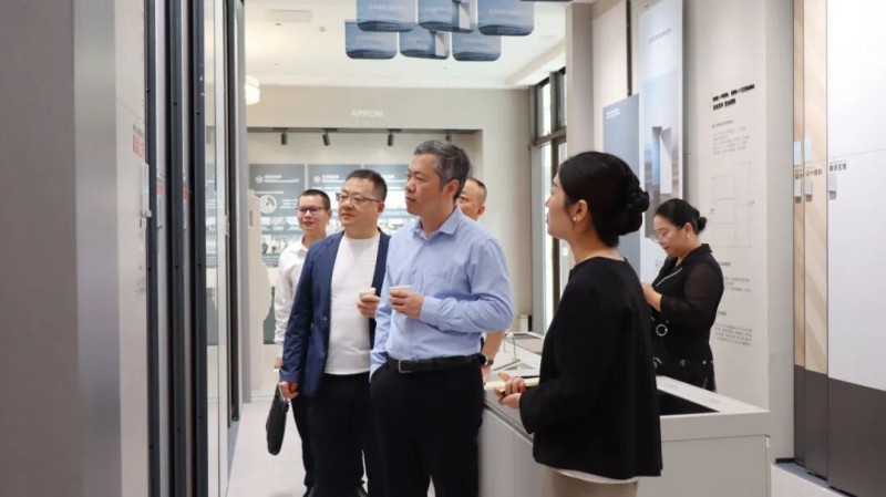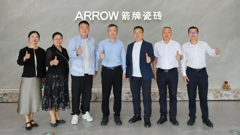▲住房和城乡建设部科技与产业化发展中心处长梁洋、中国建筑材料流通协会执委副会长李作奇一行莅临箭牌瓷砖总部大厦参观交流