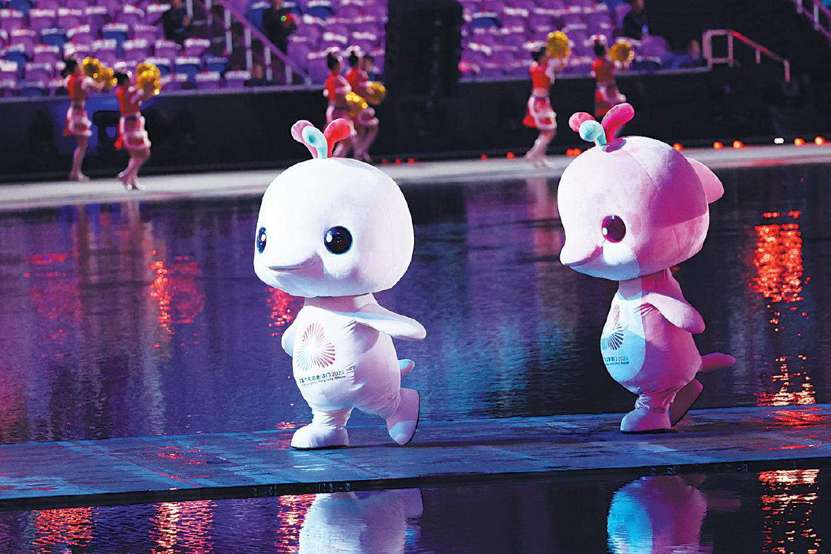 第十五届全国运动会吉祥物“喜洋洋”和“乐融融”在开幕式现场表演。 新华社记者 雒圆 摄