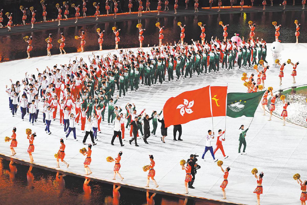广东省体育代表团、香港特别行政区体育代表团、澳门特别行政区体育代表团在入场仪式上共同入场。 新华社记者 胡虎虎 摄