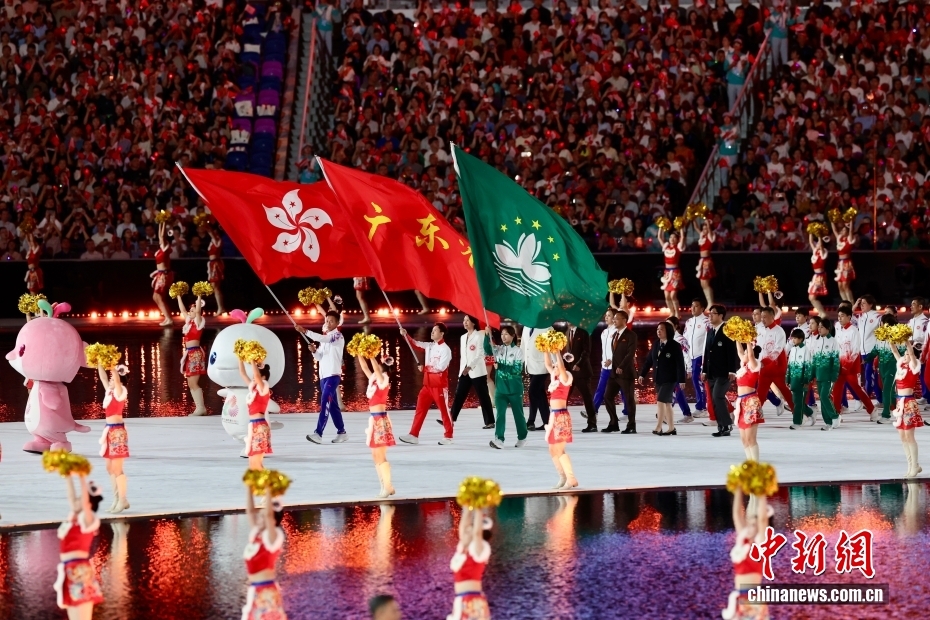 11月9日晚,第十五届全国运动会开幕式在广东奥林匹克体育中心举行。图为东道主广东、香港、澳门体育代表团同时入场。中新社记者 富田 摄