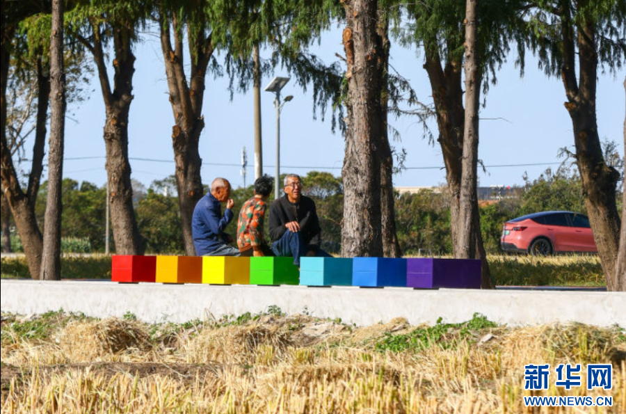 2025年10月25日,岱山县高亭镇石马岙村村民坐在新落成的景观休闲椅上话家常。 新华网发 汪菁璐摄