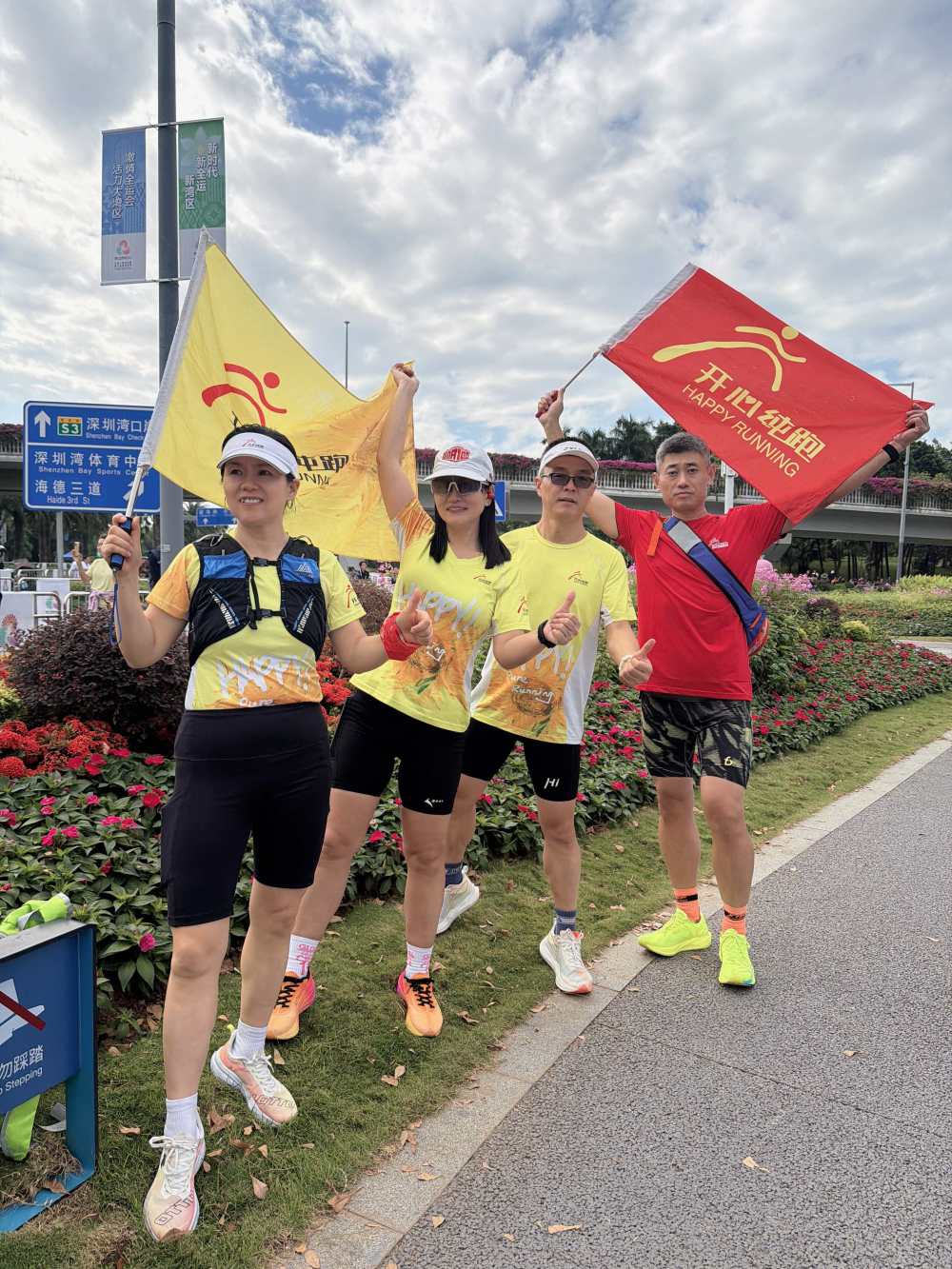 15日清早,比赛鸣枪后,他们和跑团伙伴们在一旁的深圳人才公园跑了10公里,挂着满头汗珠,来终点处等待。