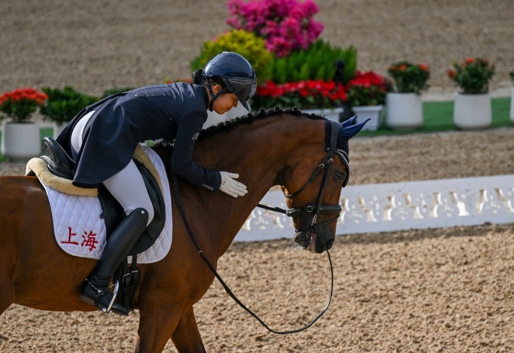 11月10日,上海队选手徐墨菲在比赛后轻拍她的马匹“好好”。新华社记者 连振 摄