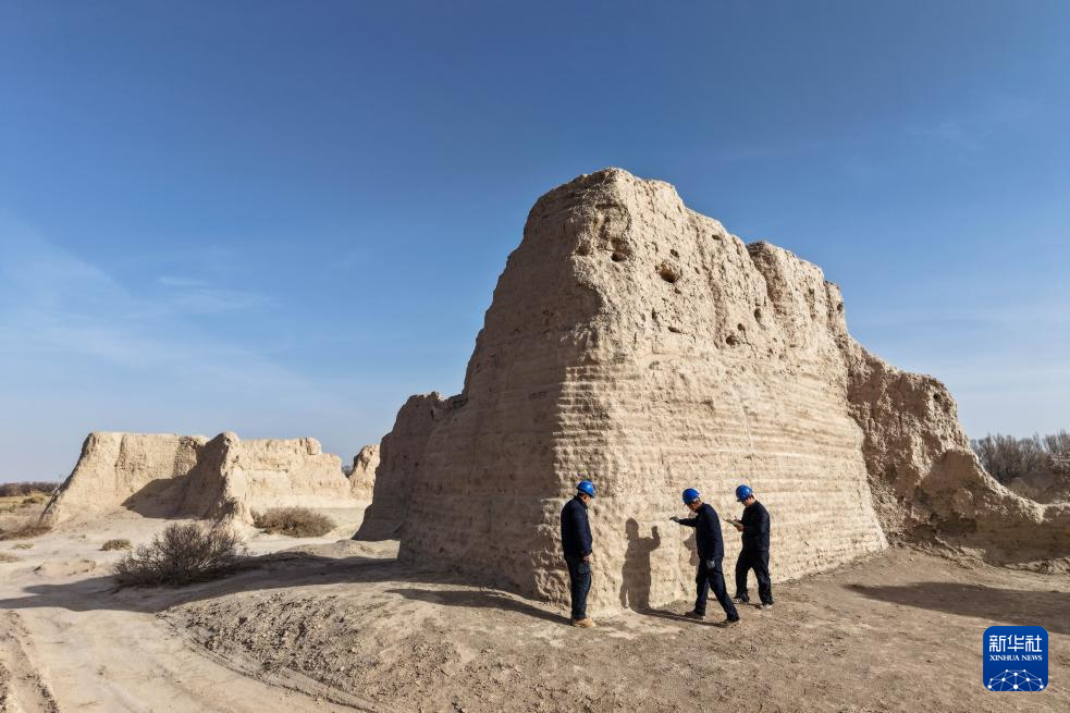 11月18日,敦煌研究院文物保护技术服务中心工作人员观察西墙马面的夯筑支顶加固效果(无人机照片)。新华社记者 郎兵兵 摄