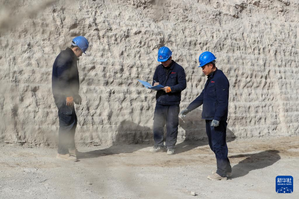 11月18日,敦煌研究院文物保护技术服务中心工作人员在观察西墙墙基排水处理效果。新华社记者 郎兵兵 摄