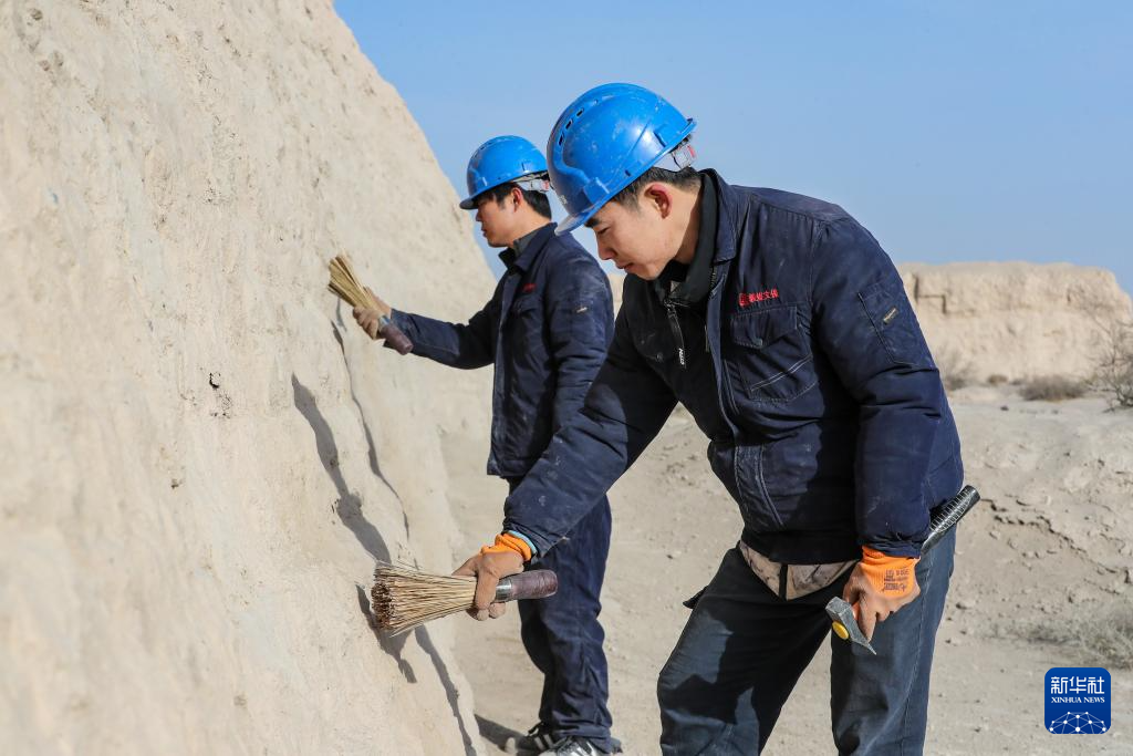 11月18日,敦煌研究院文物保护技术服务中心工作人员利用刷子对夯筑面进行修整,使其更好地与遗址墙体保持一致。新华社记者 郎兵兵 摄