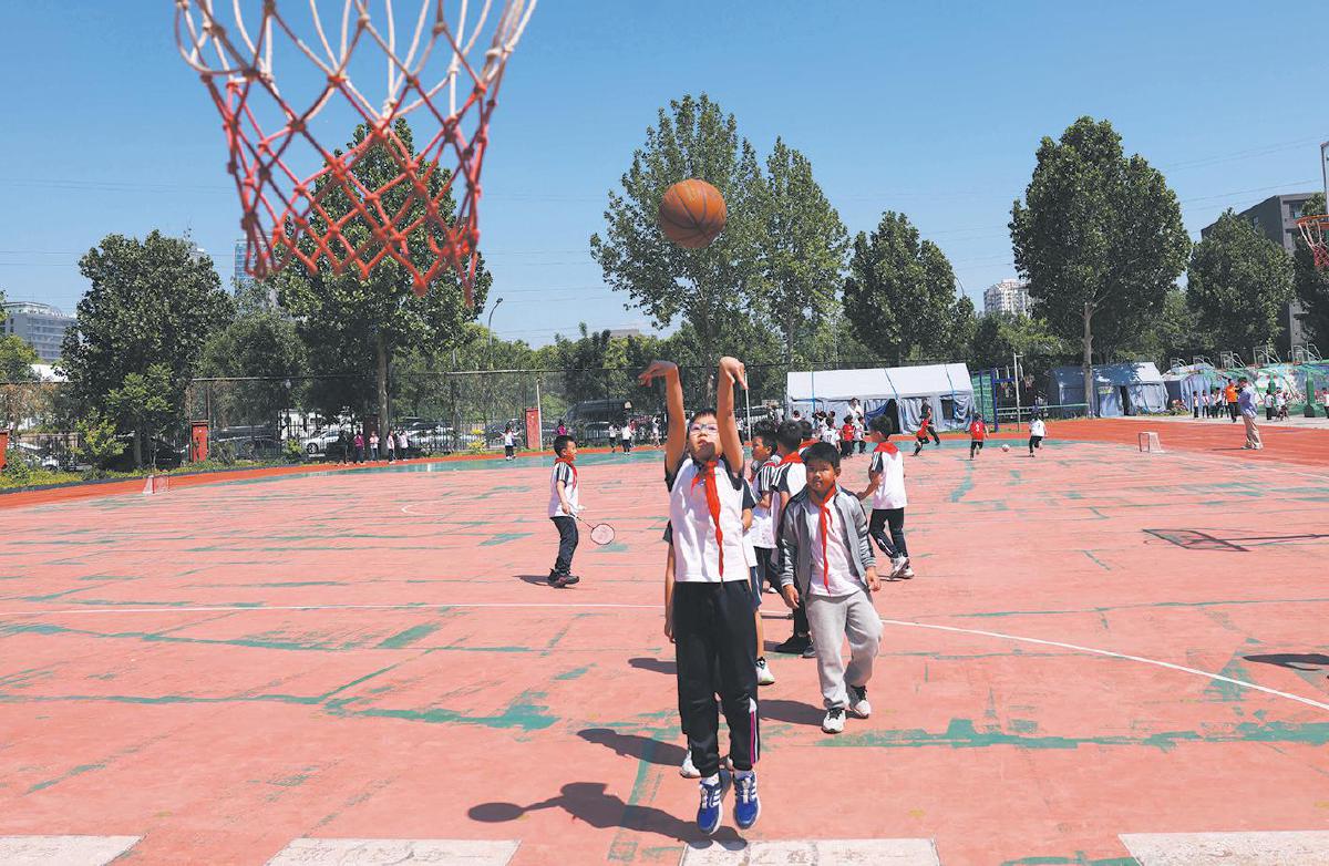 5月14日,北京市朝阳区花家地实验小学,操场上学生正在热火朝天地进行体育运动。