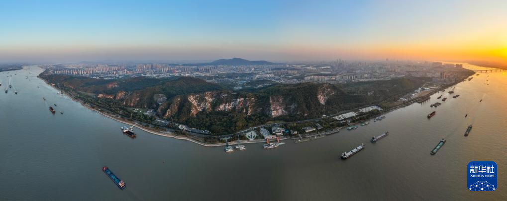 船只在南京幕燕滨江风貌区旁的长江上航行(2023年11月2日摄,无人机全景照片)。新华社记者 季春鹏 摄