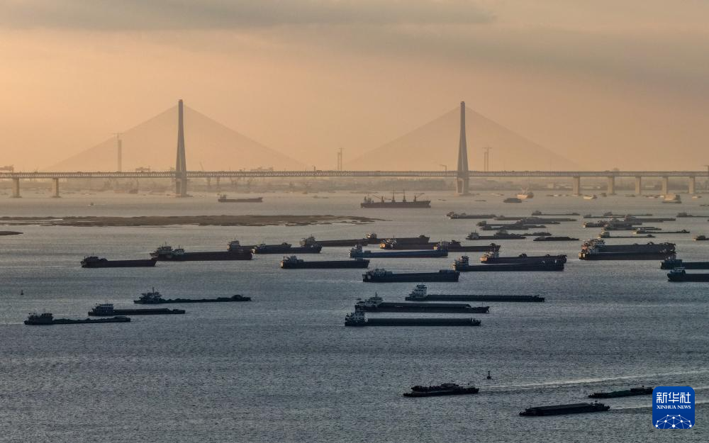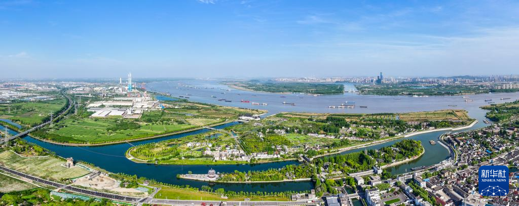 长江江苏段江面,百舸争流;江畔美景,如珠链铺展。