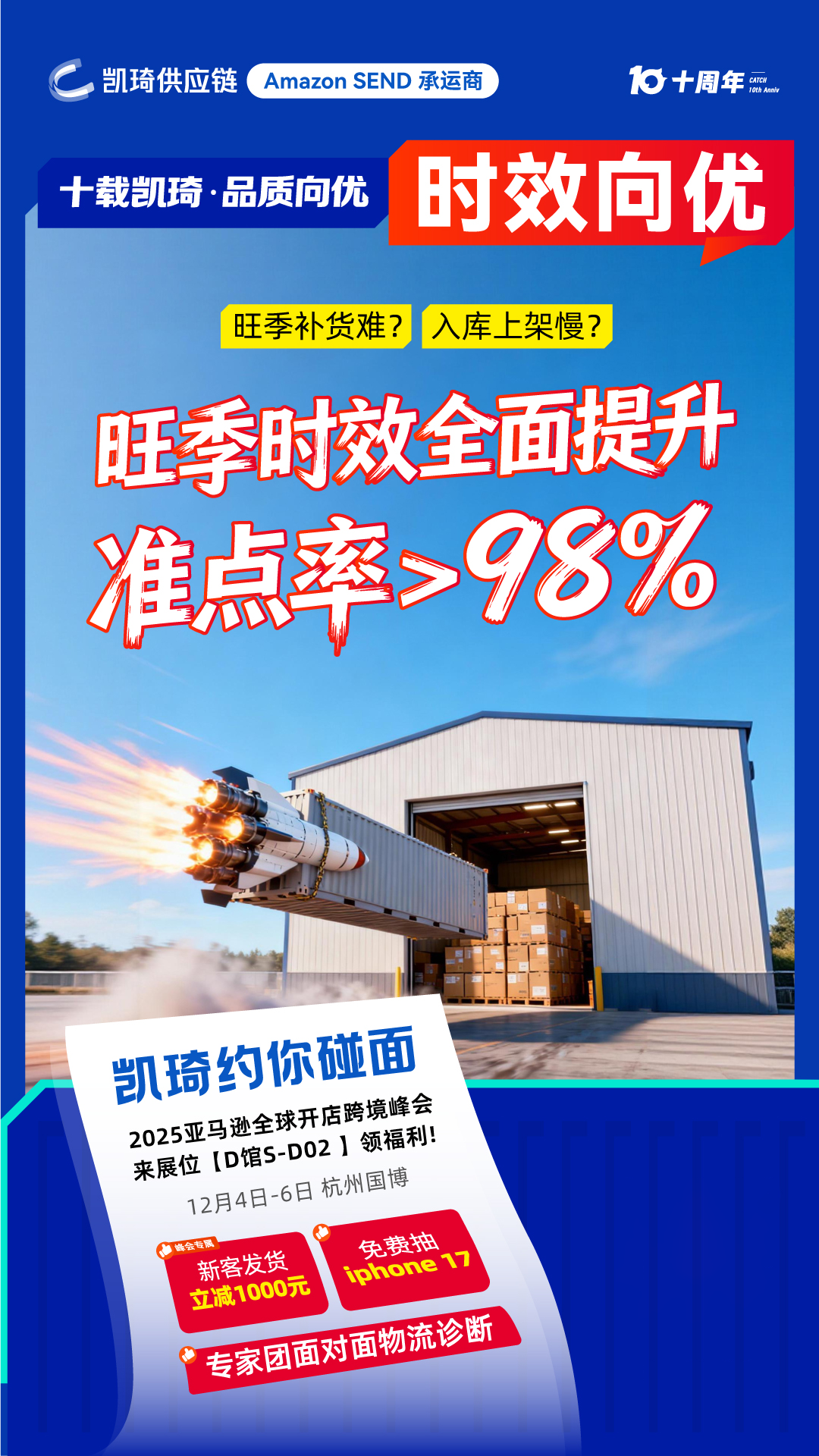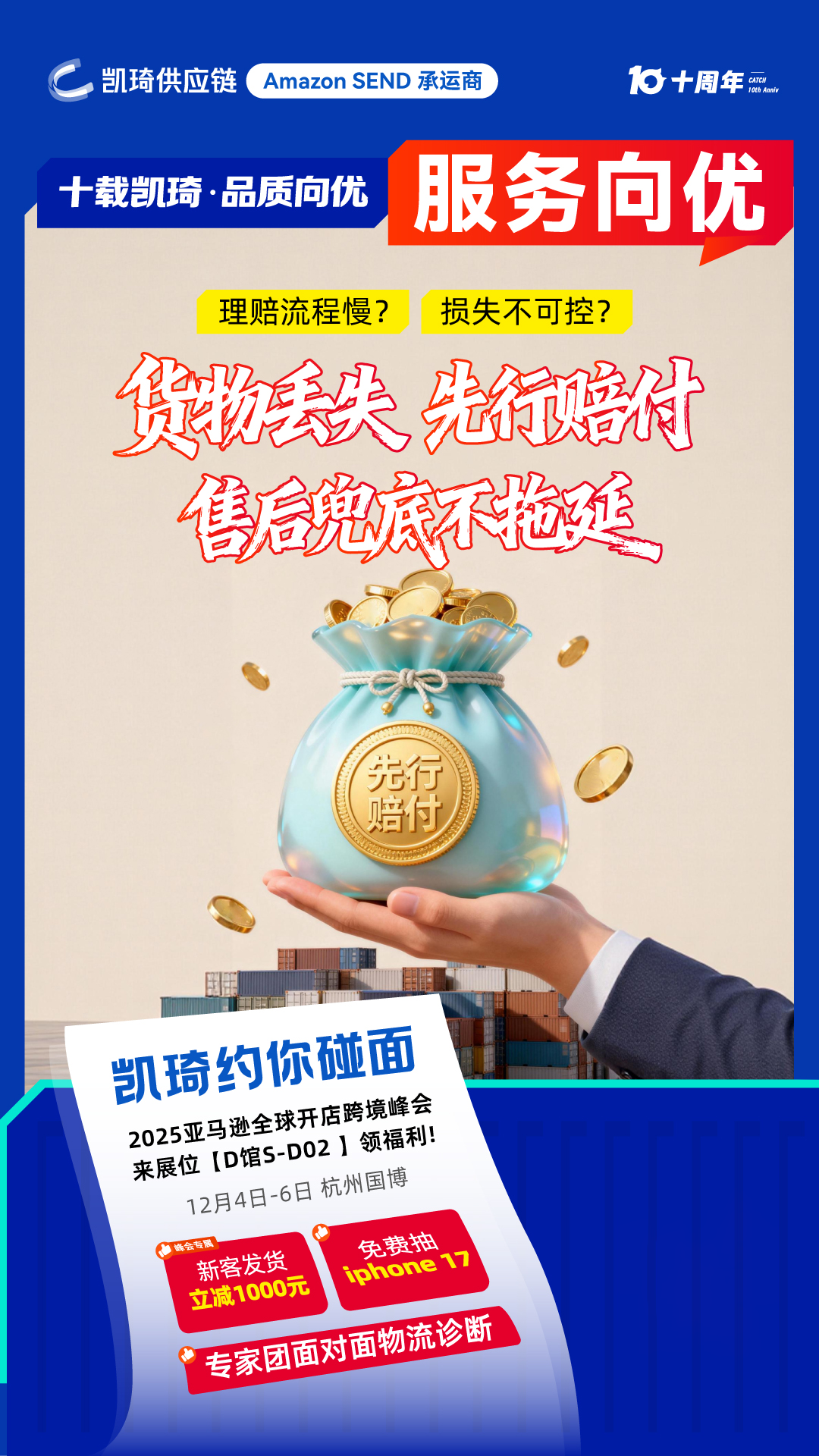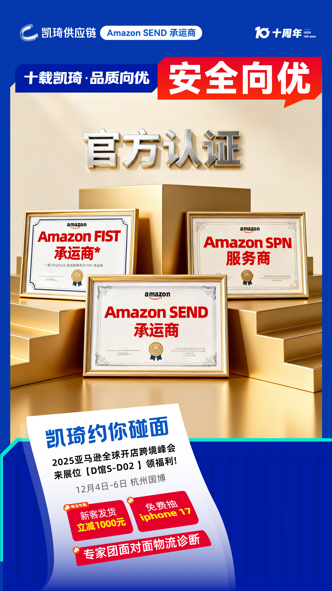 跨境电商的竞争早已从单一环节的比拼升级为全链路的协同作战,而供应链作为“出海之基”,其“稳定+高效”的品质直接决定了品牌的全球竞争力。亚马逊“向优、向新、向全球”的峰会主题,与凯琦“十载凯琦,品质向优”的理念高度契合。作为官方认证的服务商,我们深知卖家对物流时效、货物安全、服务保障的核心诉求,此次参会不仅希望吸收前沿知识,更希望将十载沉淀的品质服务传递给更多卖家,与亚马逊及行业伙伴共创更优质的跨境生态。
