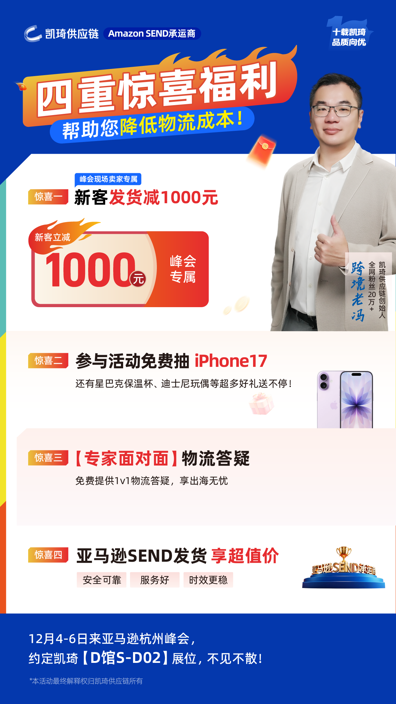 12月的杭州,注定因这场跨境盛会而焕发光彩。凯琦供应链已整装待发,期待在峰会现场【D馆S-D02】与您相遇——无论是探讨供应链优化方案,还是对接合作需求,或是领取专属福利,我们都诚意满满。关注凯琦供应链官方账号,后续我们将持续带来峰会现场的一手资讯、干货解读与精彩瞬间,与未能到场的伙伴们共享行业盛宴的价值。
