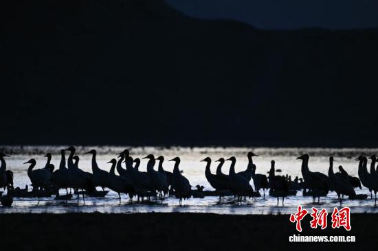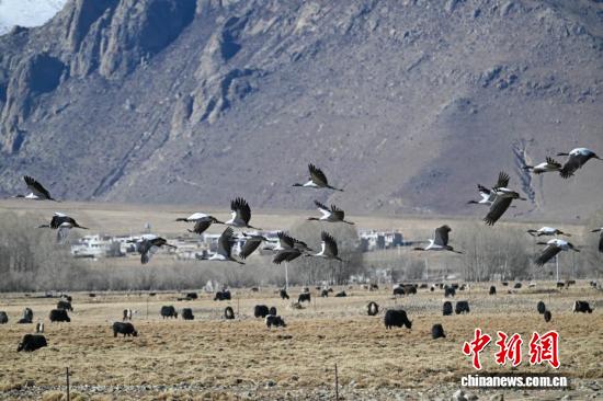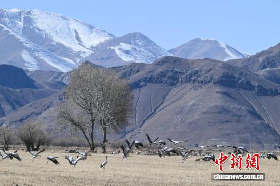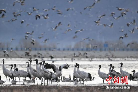 11月26日,位于西藏自治区拉萨市林周县的黑颈鹤自然保护区内,大量越冬的黑颈鹤在卡孜水库、农田、湿地里觅食、嬉戏。林周县位于拉萨河上游及澎波河流域,是黑颈鹤的主要越冬地之一。中新社记者 贡嘎来松 摄