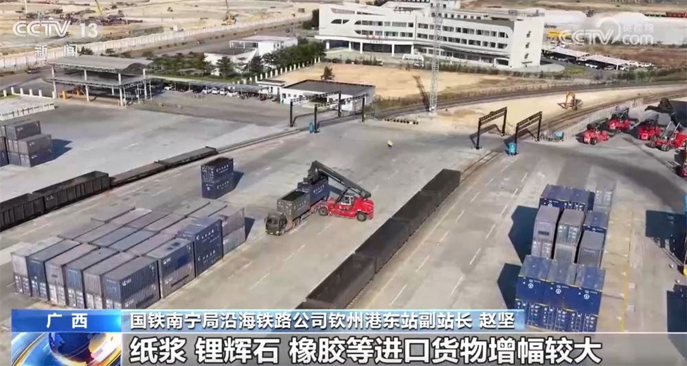 国铁南宁局沿海铁路公司钦州港东站副站长赵坚称:“今年累计6次刷新单日装卸车作业次数纪录,最高达到1405车。来自泰国、莫桑比克、印尼等国家的纸浆、锂辉石、橡胶等进口货物增幅较大,重庆的发电机组、广西的汽车零配件等出口货物增幅明显。”