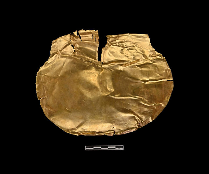 这是郑州商城书院街贵族墓地中出土的金覆面(资料照片)。新华社发(郑州市文物考古研究院提供)
