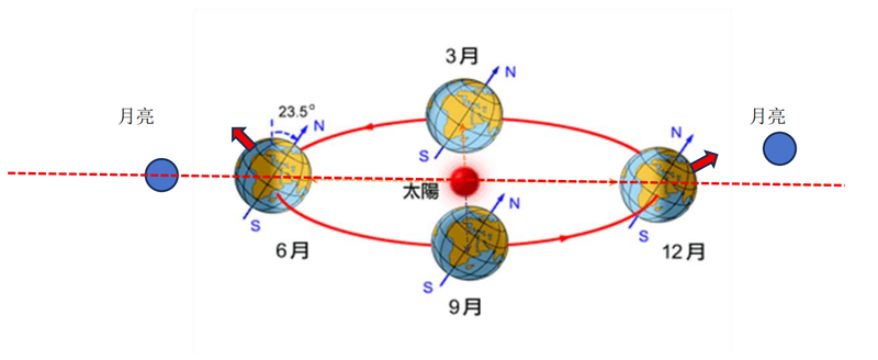 图中蓝色小球代表月亮,红色箭头代表地球上某纬度处的观察者,在冬季(图中12月处,看到的月亮最高点比较高),在夏季(图中6月处,看到的月亮最高点比较低)。受访者供图